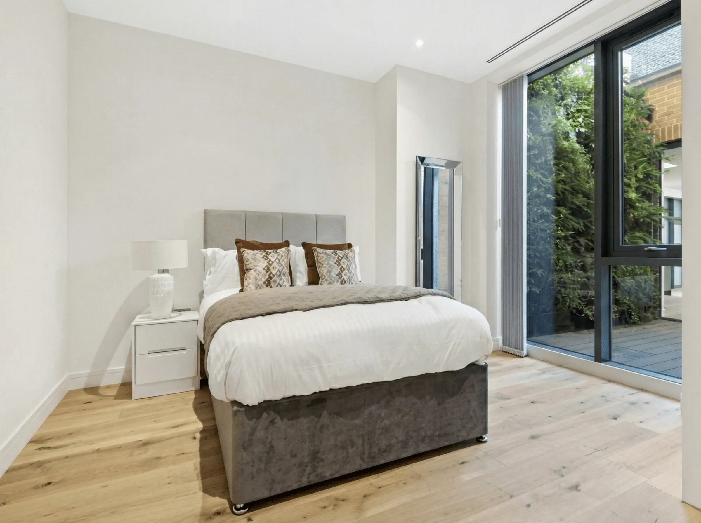 Found on the first floor of a luxury development on Borough High Street, this enormous apartment features two bedrooms, two bathrooms and two outside spaces. The main living space is softly lit by skylights and large sliding doors to one of the patios, providing the ability to open up the outside area for entertaining.