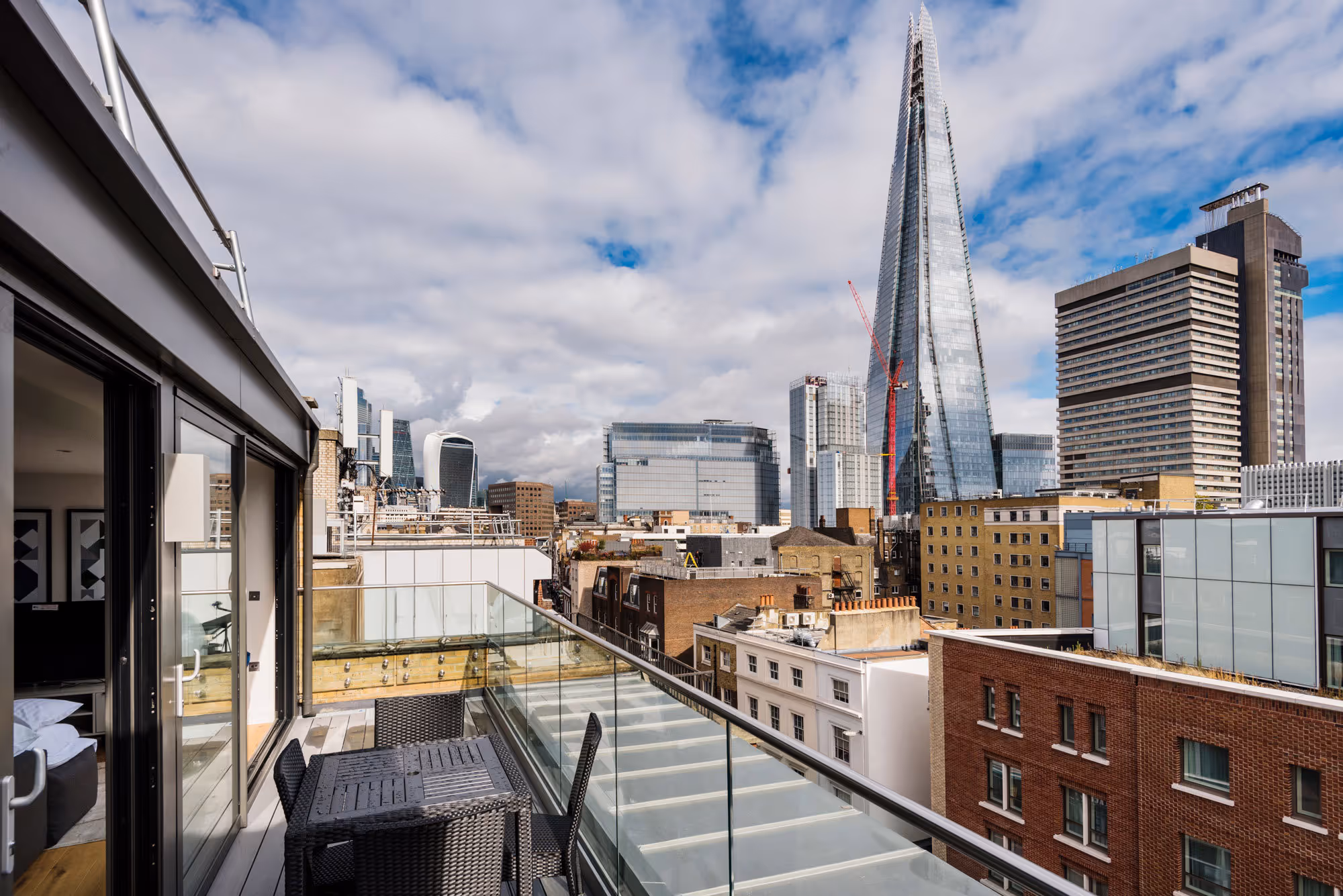 Private terraces provide uninterrupted views of The Shard and London’s iconic skyline, serving as a serene escape in this bustling riverside neighbourhood.